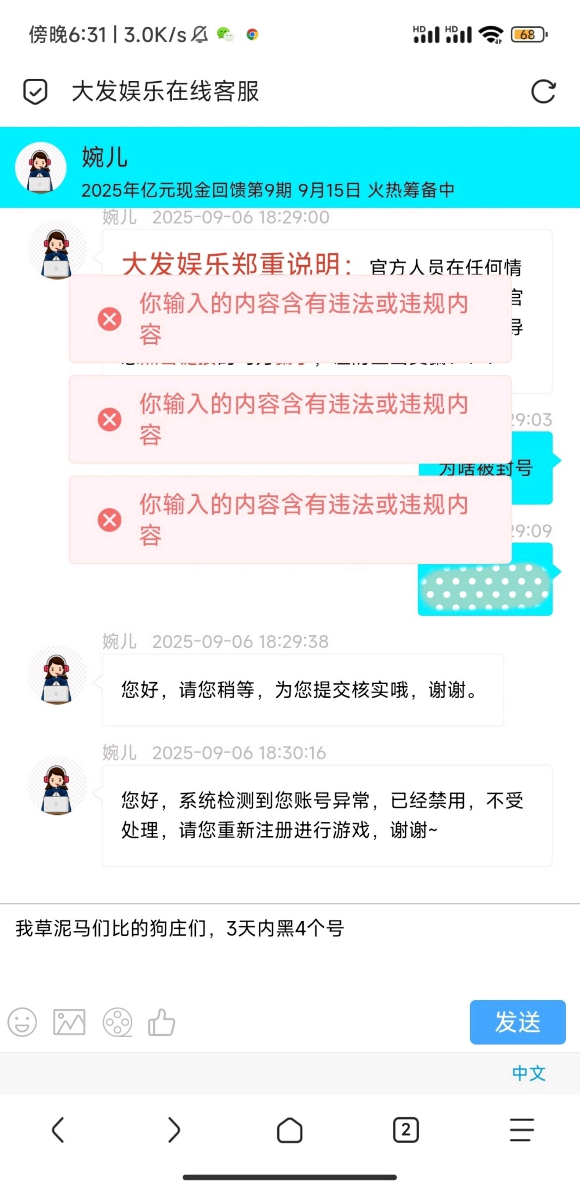 无聊刷精彩系,上号看到余额有5,拉pg给了80,本来想下,怕他又说活跃度低不给,然后就充了10块,打到100提了,结果依旧黑,而且我还是v2,玩了很多精彩系,第1次被精彩系黑,除了几年前那个必赢亚161,注册23彩金上5000黑了之外,充过的葡京662,皇冠227,永利60,bet1056,太阳2018,和前天的金沙990最多就是让我多打流水就可以出了,而且还是抢的红包,这个b大发989真的是精彩系的耻辱