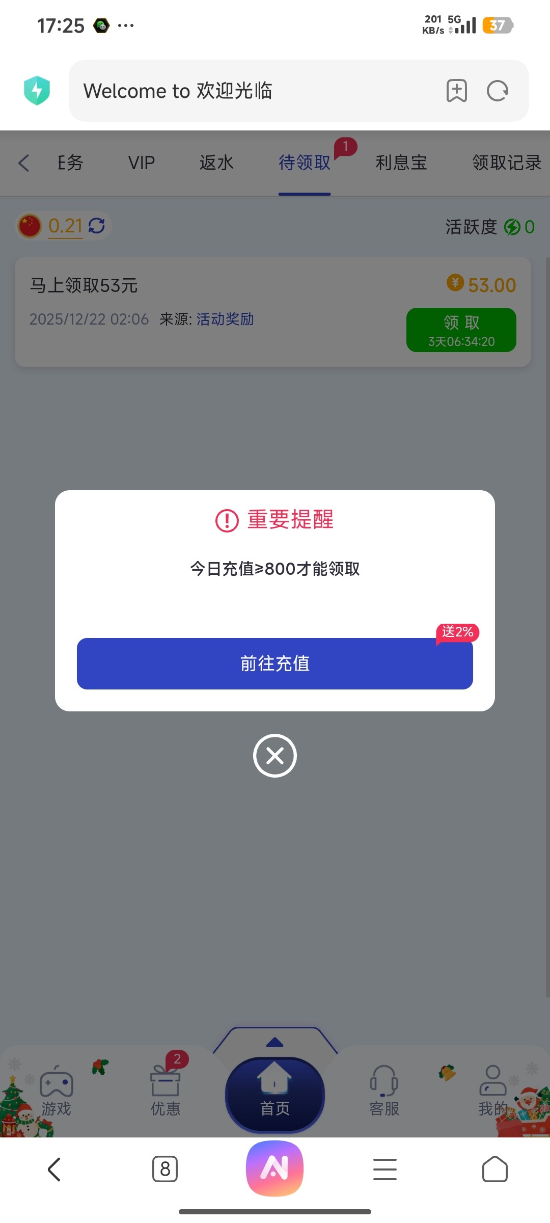 要充值800才能领取