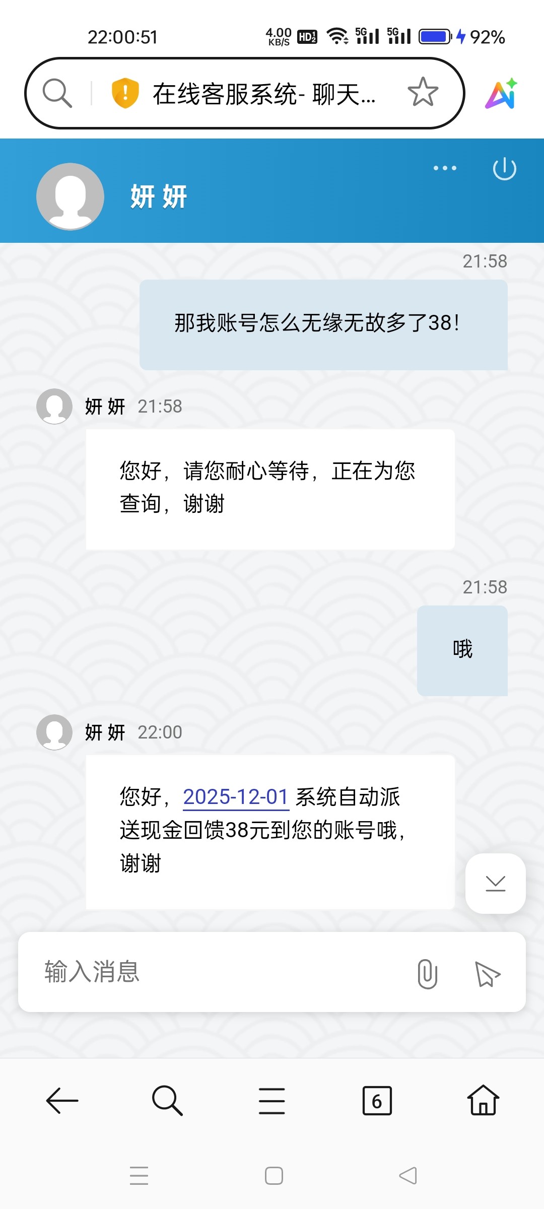 3217聚财网今天上线看了一下,送了38是12月1号送的,问客服客服说是回馈的,我充过100有回馈,老哥们有号充值过得可以去看看有就有没有就没有,领到打出来的老哥晒图反馈下,我小吃了100