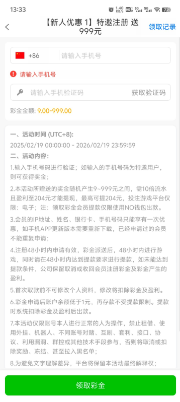 完成手机验证和新人任务都能领彩金